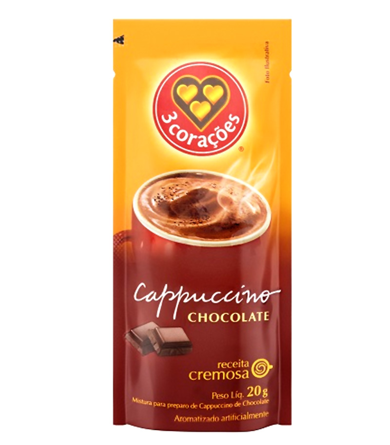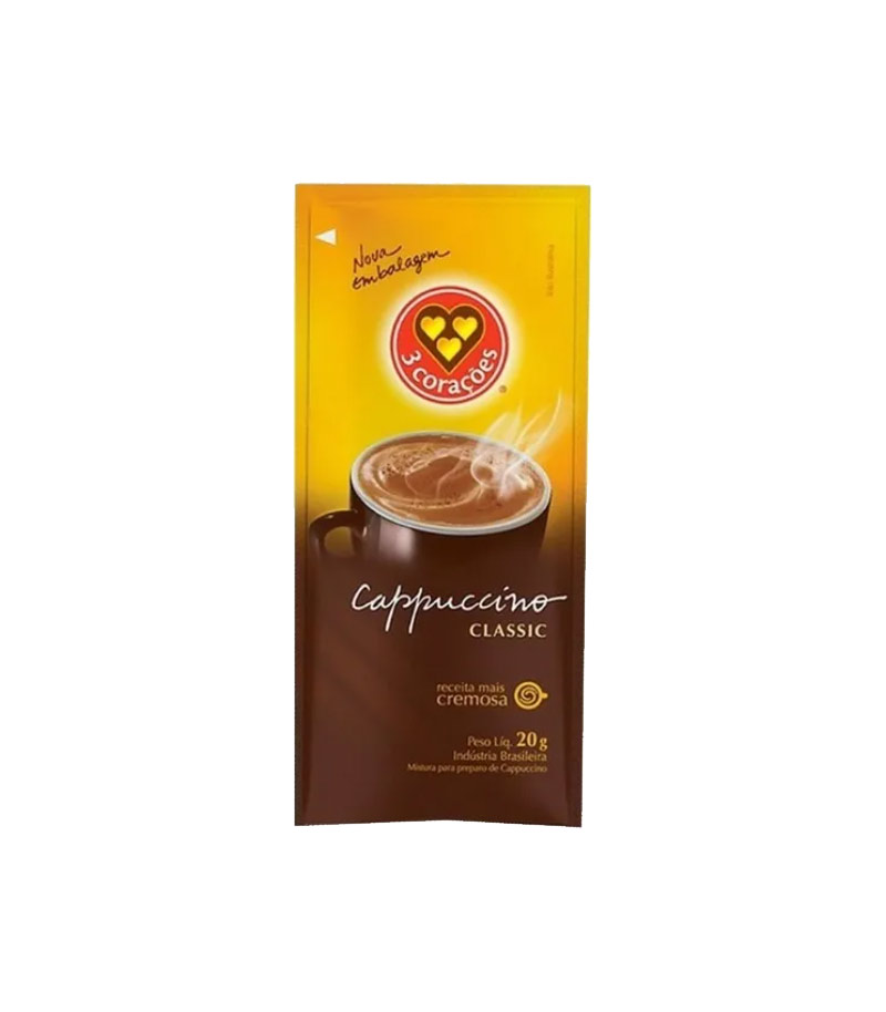 A delícia do Cappuccino 3 Corações Clássico com um toque generoso de cacau, esse cappuccino tem um gosto a mais de Brasil. - Sachê com 20g Informações sensoriais - Sabor: Característico de cappuccino adoçado sabor chocolate acentuado. - Aroma: Característico de cappuccino com chocolate. - Cremosidade: Alta - Cor: Marrom claro Ingredientes: Açúcar, leite em pó integral, soro de leite em pó, café solúvel, composto lácteo com gordura vegetal, cacau em pó, aromatizante, regulador de acidez bicarbonato de sódio, espessante carboximetilcelulose sódica e antiumectante fosfato tricálcico. CONTÉM LACTOSE. ALÉRGICOS: CONTÉM DERIVADOS DE LEITE E DE SOJA. NÃO CONTÉM GLÚTEN. Método de preparo 1. Aqueça 100mL de água. 2. Em uma xícara grande ou caneca, adicione 2 colheres de sopa (20g) de cappuccino e acrescente parte da água quente. 3. Mexa bem para dissolver por completo o pó. Coloque o restante da água e misture até obter espuma.
