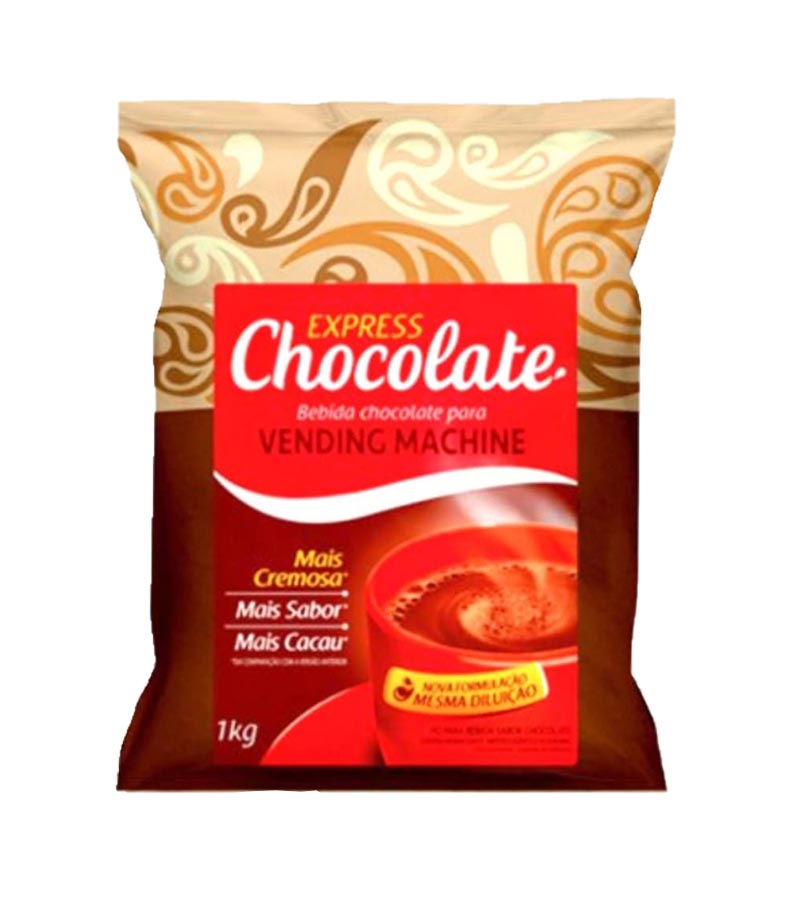 Express Chocolate Bebida chocolate para Vending Machine - 1Kg Pó para bebida sabor chocolate.Preparo instantâneo;Já contém leite. Basta adicionar água quente.Pode ser utilizado em máquinas tipo vending.Já vem adoçado.Para o preparo de bebida chocolate quente.