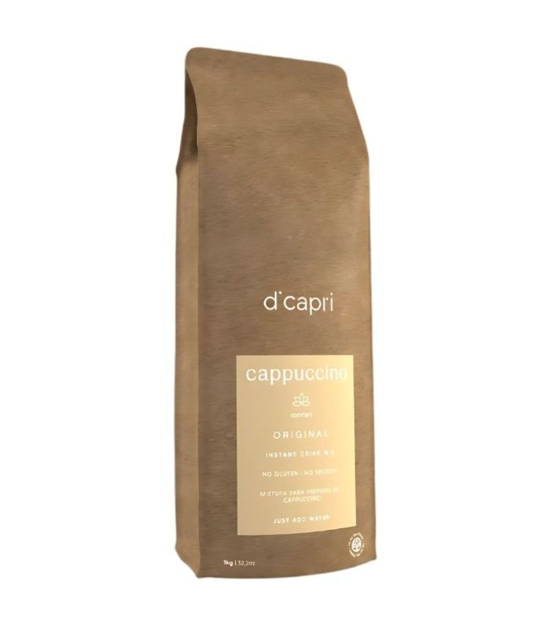 CAPPUCCINO DI CAPRI TRADICIONAL 1KG. Com tradição italiana e qualidade brasileira do café, os cappuccinos clássicos di CAPRI se diferenciam no mercado pela qualidade e composição de seus ingredientes. Sua principal matéria prima é o leite em pó, fonte de proteína, rico em cálcio, fósforo, potássio e magnésio entre outras vitaminas e minerais, além do cacau e café considerados como superfoods, ou seja alimentos que em pequenas quantidades tem alto valor nutritivo. Ele na versão tradicional já vem adoçado, sendo ideal para quem quer praticidade e rapidez no preparo, pois basta adicionar água fervente para preparar um delicioso cappuccino, ou até mesmo na versão gelado bastando bater no mixer ou liquidificador.