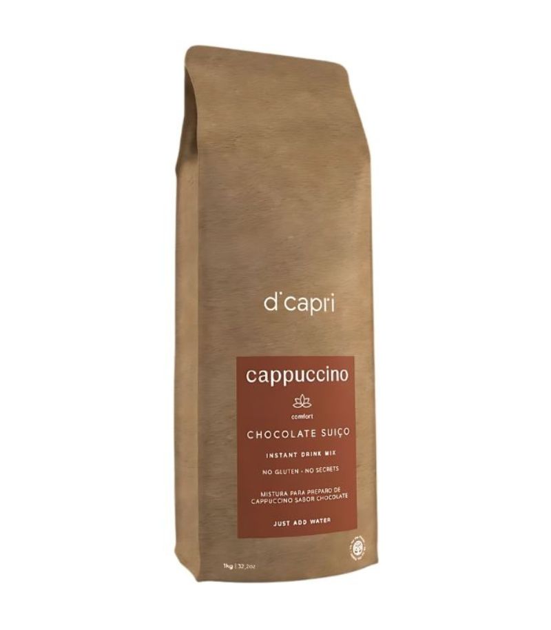 CAPPUCCINO DICAPRI CHOCOLATE SUÍÇO 1KG. Com tradição italiana e qualidade brasileira do café, os cappuccinos clássicos di CAPRI se diferenciam no mercado pela qualidade e composição de seus ingredientes. Sua principal matéria prima é o leite em pó, fonte de proteína, rico em cálcio, fósforo, potássio e magnésio entre outras vitaminas e minerais, além do cacau e café considerados como superfoods, ou seja alimentos que em pequenas quantidades tem alto valor nutritivo. Ele na versão tradicional já vem adoçado, sendo ideal para quem quer praticidade e rapidez no preparo, pois basta adicionar água fervente para preparar um delicioso cappuccino, ou até mesmo na versão gelado bastando bater no mixer ou liquidificador.